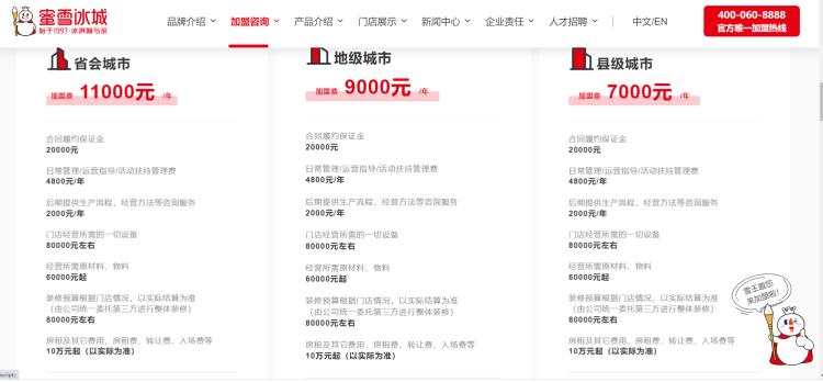 蜜雪冰城加盟费分成三个城市:省会城市10000元/年地级市8000/年县级城市6000/年。合同期限分为三年。(一般都是可以续约的)保证金:为确保加盟商履行特许经...
