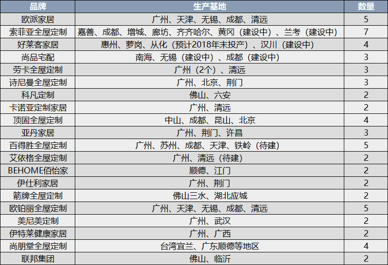 生产基地是全屋定制品牌产能的象征,也体现着加盟后品牌的交付能力,下面,龙博士将珠三角地区有2家及2家以上生产基地 的品牌列举了出来:
