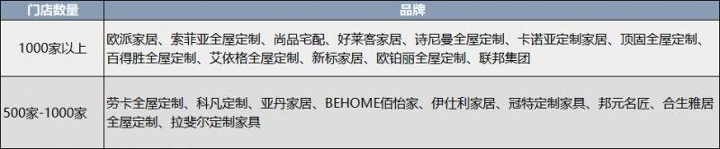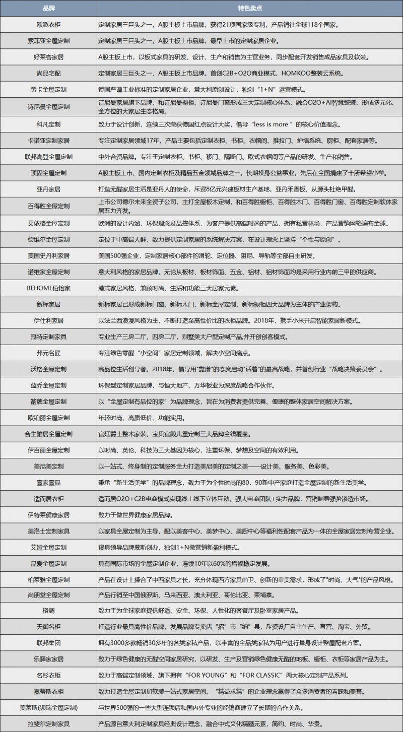 欧派、索菲亚、好莱客、尚品宅配、劳卡全屋定制、诗尼曼全屋定制、科凡全屋定制、卡诺亚定制家居、联邦高登全屋定制、顶固全屋定制、亚丹家居、百得胜全屋坂木定制、艾依格全屋定制、德维尔全屋定制、美国史丹利家居、诺维家全屋定制、佰怡家、新标家居、伊仕利衣柜、蓝乔全屋定制、箭牌全屋定制、欧铂丽全屋定制、合生雅居全屋定制、伊百丽全屋定制、美尼美定制、壹家壹品、适而居衣柜 、伊特莱健康家居、美洛士定制家具、艾娅全屋定制、品爱全屋定制。