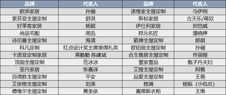 下面再来看看珠三角经济圈定制家居品牌代言人的签署情况 :