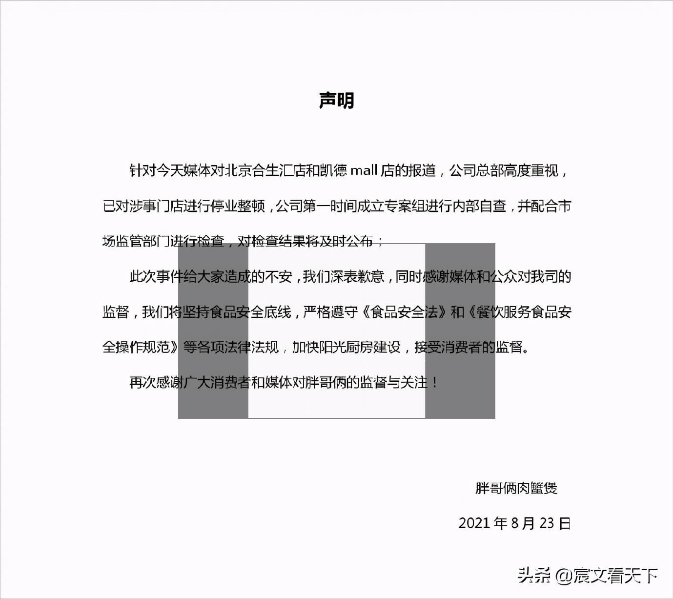 8月23日午间,胖哥俩通过其官方微博发布声明称,针对今天媒体对北京合生汇店和凯德mall店的报道,公司总部高度重视,已对涉事门店进行停业整顿,公司第一时间成立专案组进行内部自查,并配合市场监管部门进行检查,对检查结果将及时公布。