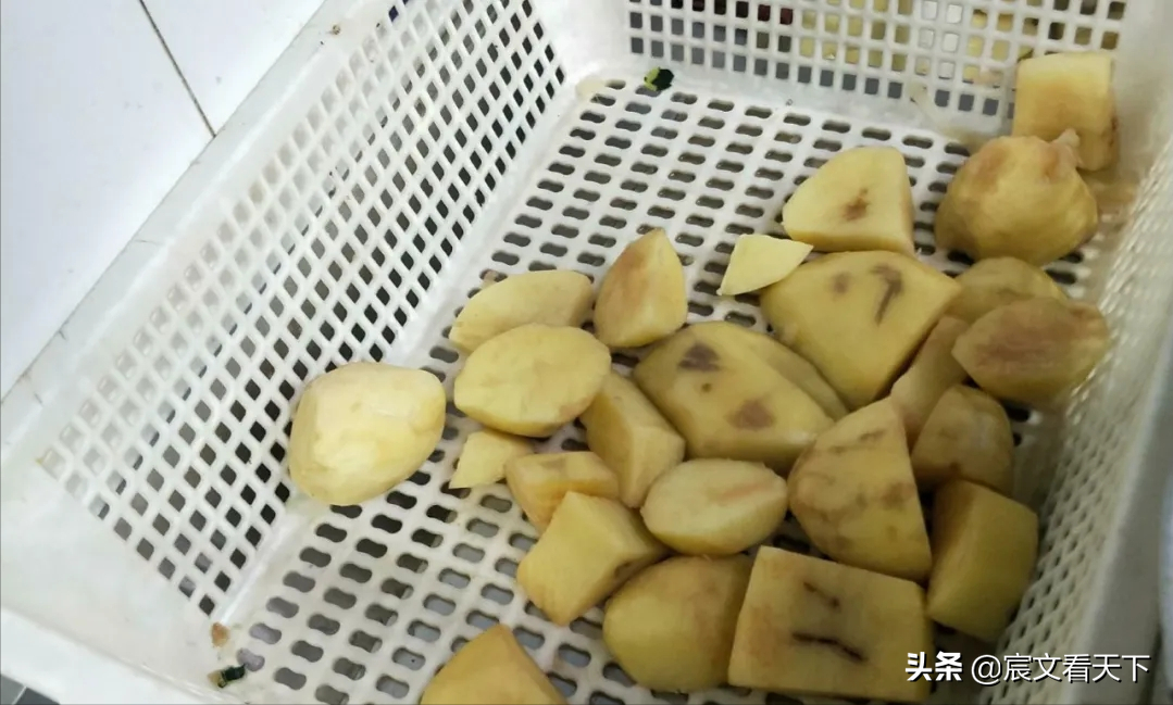 这些土豆足有上百斤。当晚,这名员工吩咐记者将这批土豆拆开剁块。果然,第二天,尽管有些土豆已经变质,但仍被后厨当做新鲜食材继续使用。