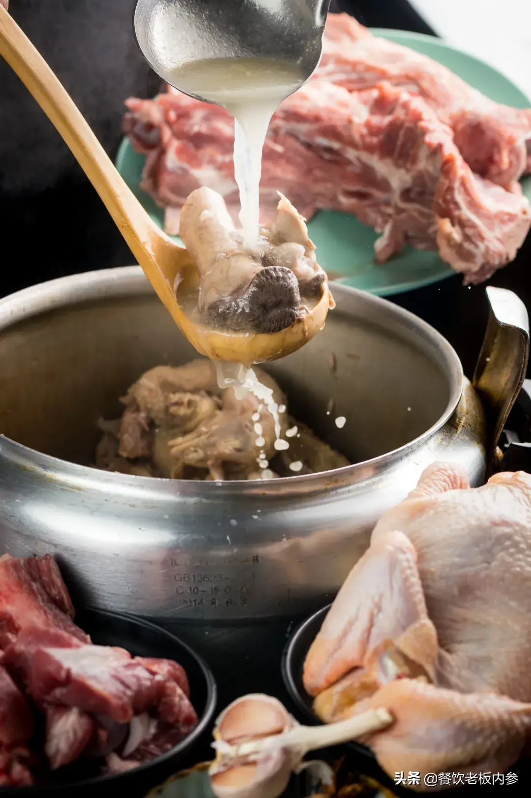 底汤则选用当天宰杀的猪棒骨,新鲜的猪脚、五花肉,800天以上散养老母鸡和26味中草药,经过7道加工工序,24小时熬制。