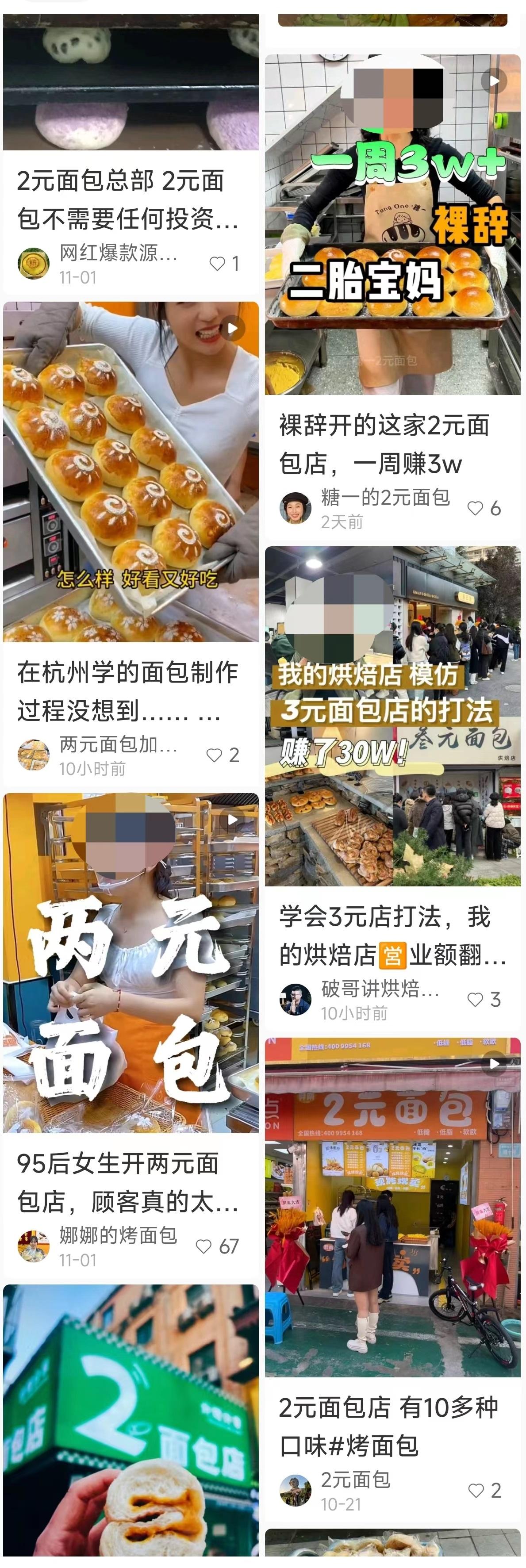 随着2元面包店在各地走红,网上类似展示开店成果的帖子随之增多。店主“糖一”的人设是山艺毕业生,二孩宝妈。另一位名叫“柠萌做面包”的店主,在视频中称自己辞去空姐工作,投资2万元开了2元面包店,日营业额超3000元。还有网名为“破哥烘焙运营咨询”的店主,自称十年烘焙人,模仿3元面包店的运营手段,一个月赚了20万元。