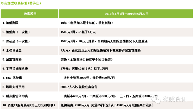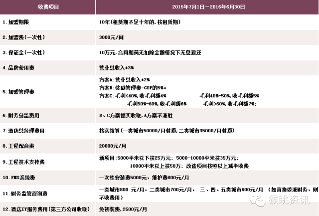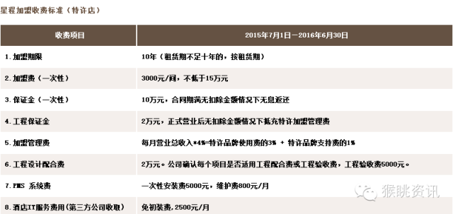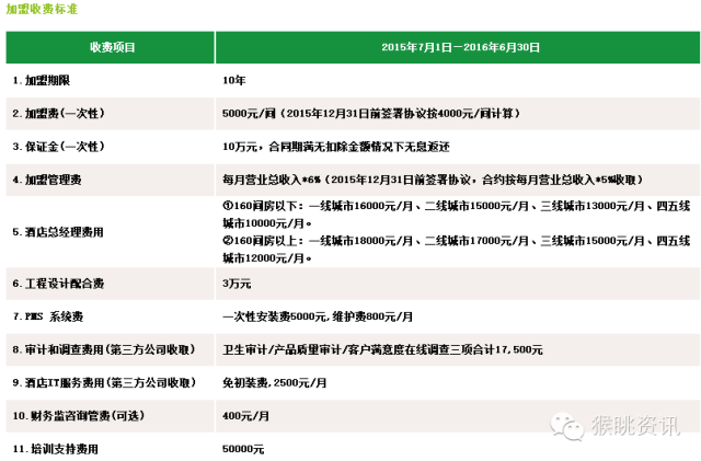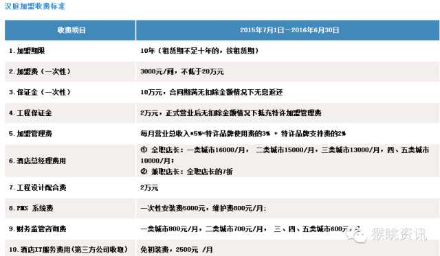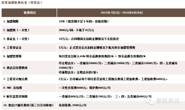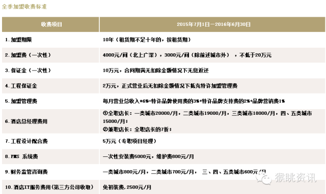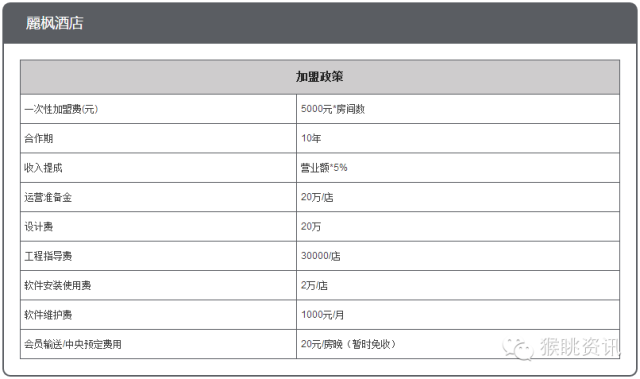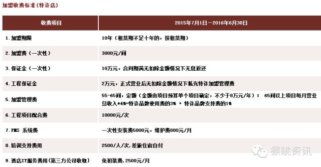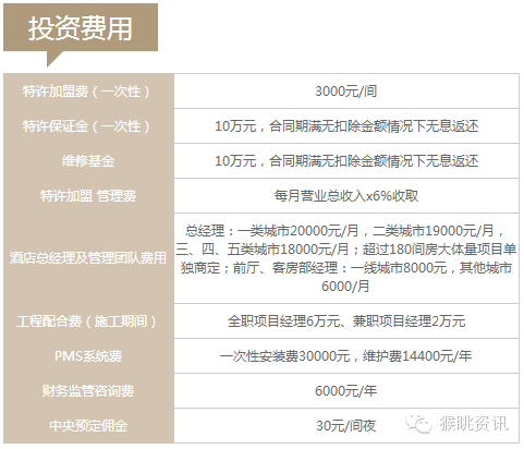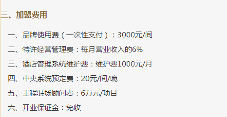 目前特许加盟费,行业内都是按单间报价,要结合加盟条件中的房间数来看,计算下来,基本都在30万元以上,只有亚朵是在40万元以上。