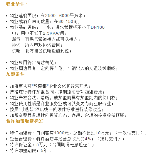 如家、7天连锁酒店客房数量要求在60间客房以上,加盟费每个房间3000元,投资600万以上;尚客优起步于二三线城市,加盟费每个房间1500元,投资80-250万。如家、7...