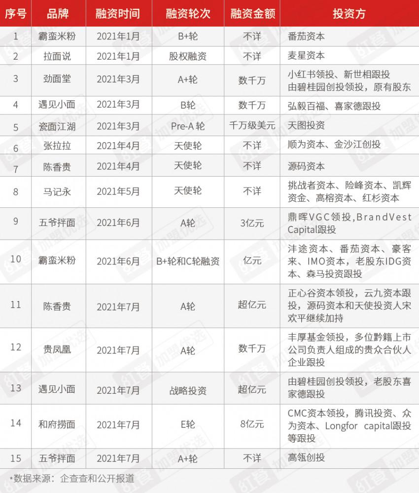 据不完全统计,2021年1-7月,餐饮领域共有70多起投融资事件,其中,面食赛道共计15起。从融资金额来看,亿元级及以上的投融资至少5起。