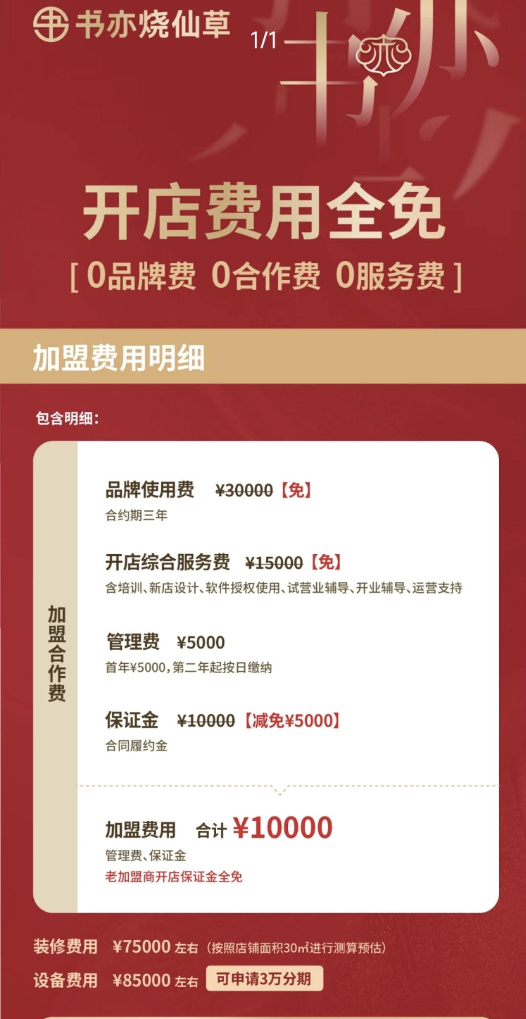 随后书亦烧仙草也发布“开店费用全免”活动,3万元的品牌使用费和1.5万元的综合服务费全部限免,此外原本1万元的保证金也降低至0.5万元。13万余元的启动资金就可以开设书亦烧仙草的门店。