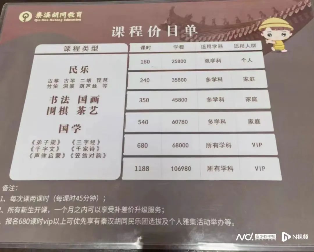 刘小姐是秦汉胡同的学员家长之一。2023年4月,她在深圳秦汉胡同侨香分馆花费14800元购买课程,她在接受记者采访时表示,“当时我报的是他们的竹笛班,我买了88个课时,每次课小孩去上一个半小时,他一次就会扣两个课时,所以大概折合起来一节课可能要300多。”