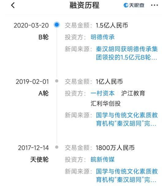 2020年3月,秦汉胡同宣布完成1.5亿元B轮融资,领投方为明德传承。该年年中,秦汉胡同宣布启动开放业务,“在下沉市场谨慎建立合作分馆”。