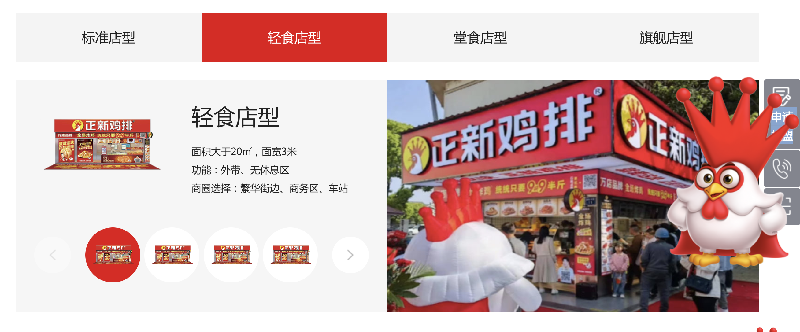 《每日经济新闻》记者在正新招商官网看到,正新门店分为四种类型——标准店型、轻食店型、堂食店型、旗舰店型。四种店型均要求最小面积20平方米,区别在于开间大小为2~3米不等,其他条件均相同。