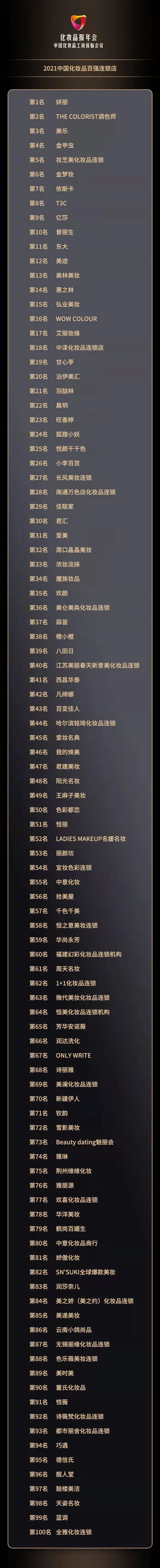 特别指出的是,对于极少数明确表明不参评及拒不配合调研的化妆品连锁店及代理商,化妆品报年会组委会决定,不再将其纳入评选范围。据此,化妆品报年会组委会最终遴选出2021年中国化妆品百强连锁店榜单: