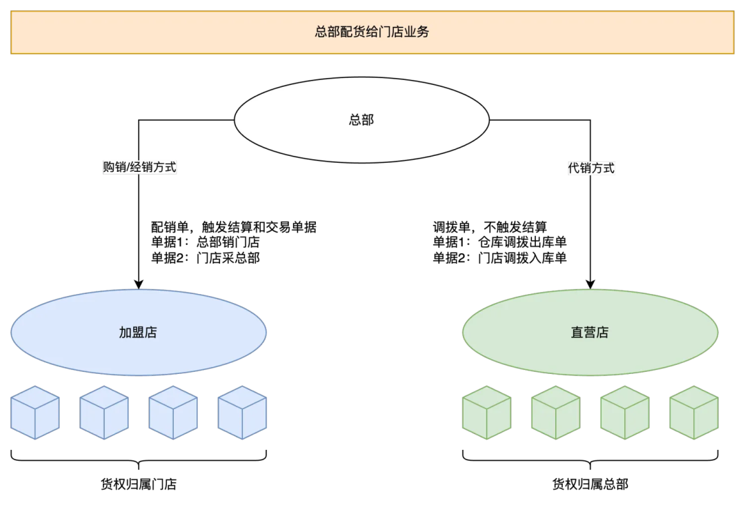 其次就是要做到,业务实物流和财务信息流解耦划分,因为无论是配货给加盟店还是配货给直营店,从实物流的角度,应该都是一样的操作,所以相关的业务单据和流程要尽量做到一样;针对财务结算的信息,则需要单独拉一条线来考虑结算关系怎么处理,这些业务单据是否要用“虚拟单据”来承载。