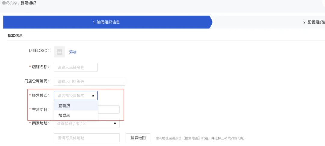 在“有赞”的零售业务中,如果要创建一个门店,那么必须要先选择对应的经营模式是“直营店”还是“加盟店”。因为这两者在财务结算上有明细的差异,所以在定义门店的时候就要先确认好类型,对应后续的供应链操作都会有所不一样。