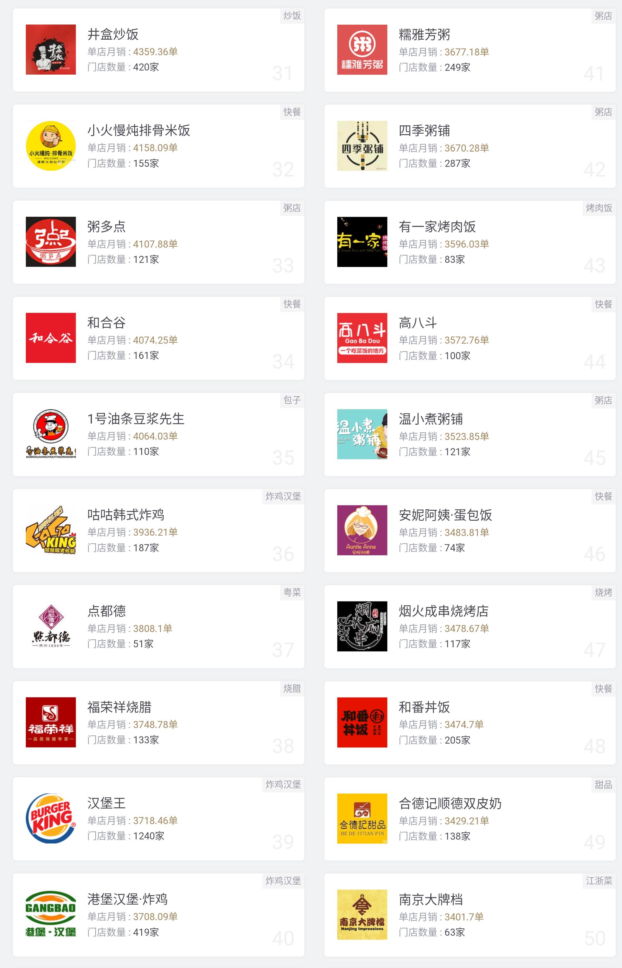 餐眼数据对一定规模(50家)以上的连锁餐饮品牌进行了外卖数据分析,发现这50个品牌做的比较突出。