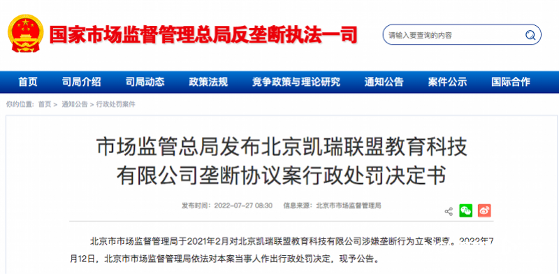 7月27日,据国家市场监管总局反垄断执法一司官网消息,教培行业迎来一起反垄断执法案件。因与加盟商达成固定芝麻街英语课程价格的垄断协议,北京凯瑞联盟教育科技有限公司被罚94万元,系2020年销售额3%的罚款。