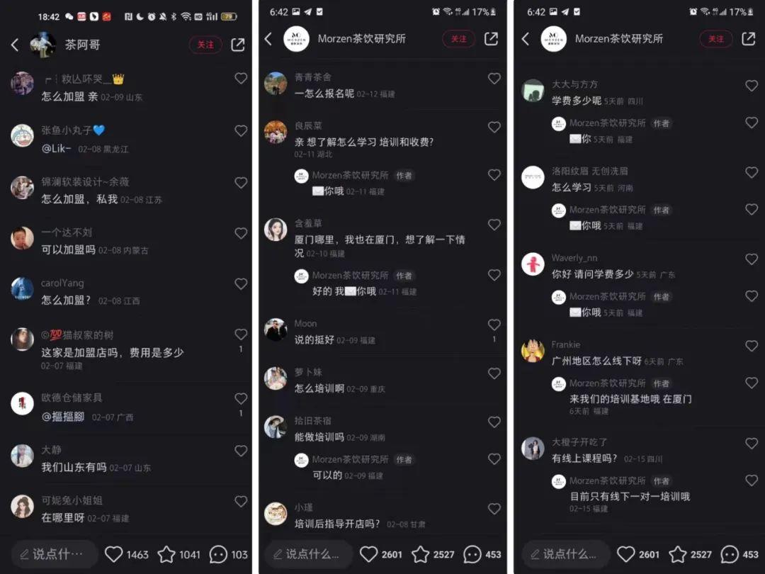 小红书、抖音上有好些人教开新中式茶馆,这些的账号下面常有一长串的留言,内容简洁,“求联系”,“怎么加盟”。比较火的“作者”不会每个都回,在长长的评论里挑几个,回复“私[心]”,“小窗聊”。