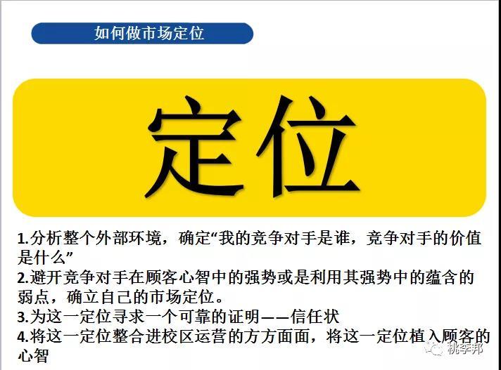 一定要做地区客户需求分析和调研,不要盲目的设置课程。选定课程之后,做区域竞品分析,一定要给自己的机构和课程有一个很好的定位。教育市场那么大,你不可能什么都做,把所有客户都当作你的菜,这真的不太现实。中国市场那么大,弱水三千,只取一瓢饮即可。