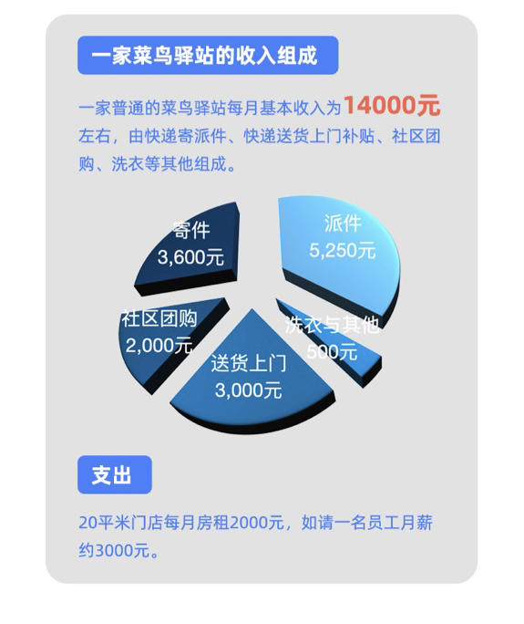 跟其他连锁加盟不一样,加盟菜鸟驿站没有加盟费,但需要保证长期且持续的经营,收入的话,除了快递服务,还有社区团购、洗衣、回收其他收入,如果大点的成熟小区,还能卖广告。