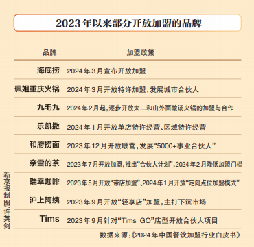 2022年底,喜茶开放加盟,奈雪的茶紧随其后,于2023年7月启动加盟业务。2024年春天,加盟的风吹到了头部餐企。2月,九毛九集团宣布开放加盟业务,3月,海底捞公开招募加盟商。在头部餐企的带领下,珮姐重庆老火锅等此前坚持直营的品牌也相继放开加盟。有观点认为,海底捞等直营品牌开放加盟,表明餐饮行业风向的清晰变化,加盟模式在推动连锁化率提升中扮演关键角色。中国连锁经营协会发布的《2024年中国餐饮加盟行业白皮书》中提到,无论是头部企业的持续扩张,还是连锁品牌向低线城市的渗透,以及连锁化率的稳步提升,都离不开特许加盟模式的普及。