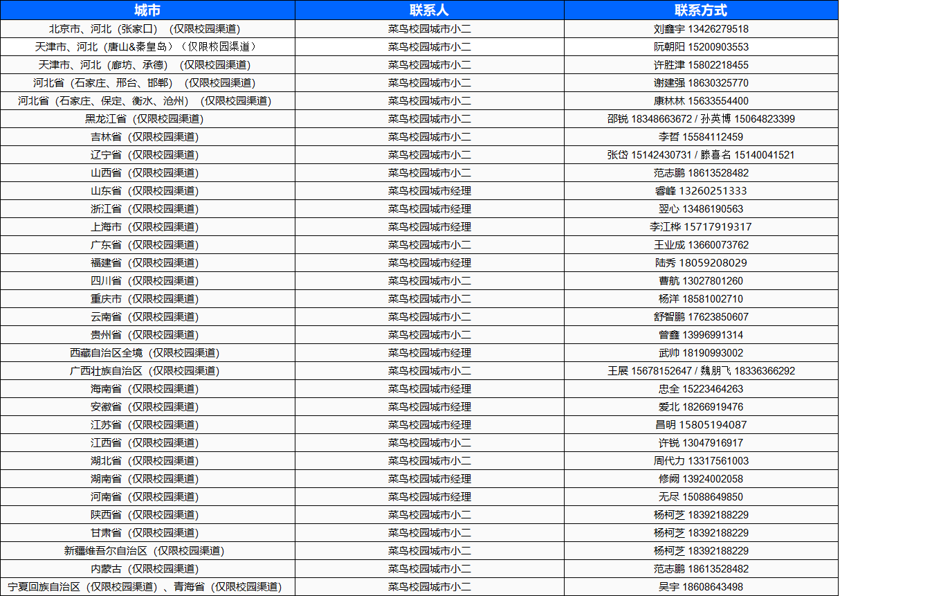 菜鸟对于具备一定商业基础且保证服务质量能力的服务商,允许其在指定区域内拓展、运营、管理菜鸟驿站站点,以下为菜鸟官方授权服务商 (一起来看您所在地区的官方授权服务商!):