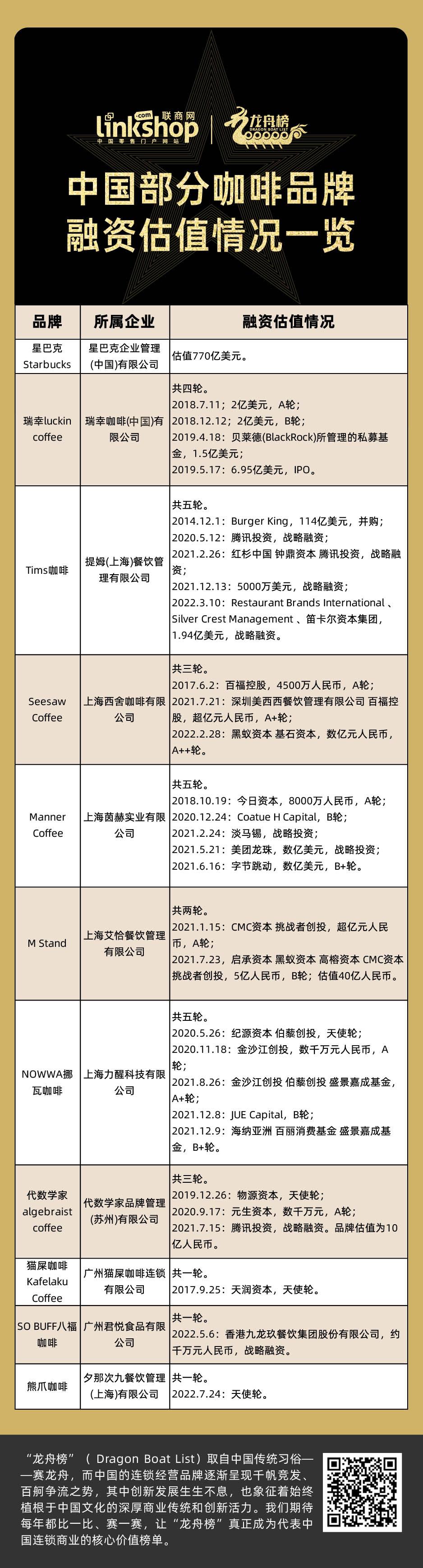 2022年,咖啡行业依旧是资本“宠儿”。《联商网》统计了部分咖啡品牌的融资估值情况。