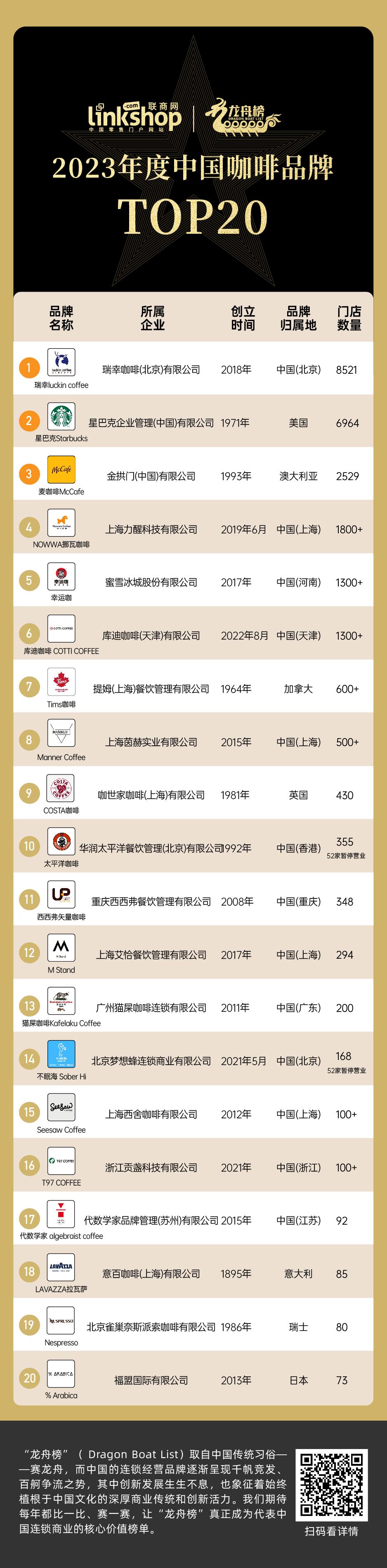 本期,《联商网》评选出龙舟榜之“2023年度中国咖啡连锁品牌TOP20” ,以门店数量为标准,辅以消费者好评度、融资情况,以及新锐咖啡品牌,同时结合了多位行业人士的看法,以此探索咖啡赛道的发展趋向。