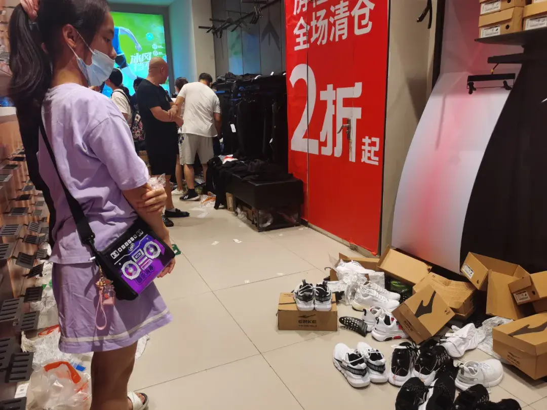 7月26日上午,北京鸿星尔克百荣世贸商城店里人流如潮。门店入口,硕大的“夏季清仓”“全场二折起”“买一送一”的促销海报仍贴在玻璃门上,但店内四面墙的货架上鞋子寥寥无几。