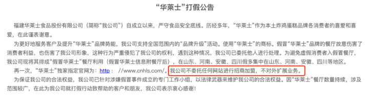 在各个平台,你很难找到华莱士加盟的信息。官方还会主动上阵打假,表示自己不对外拓展业务。从所有品牌的加盟模式来看,华莱士的这种模式独一份。