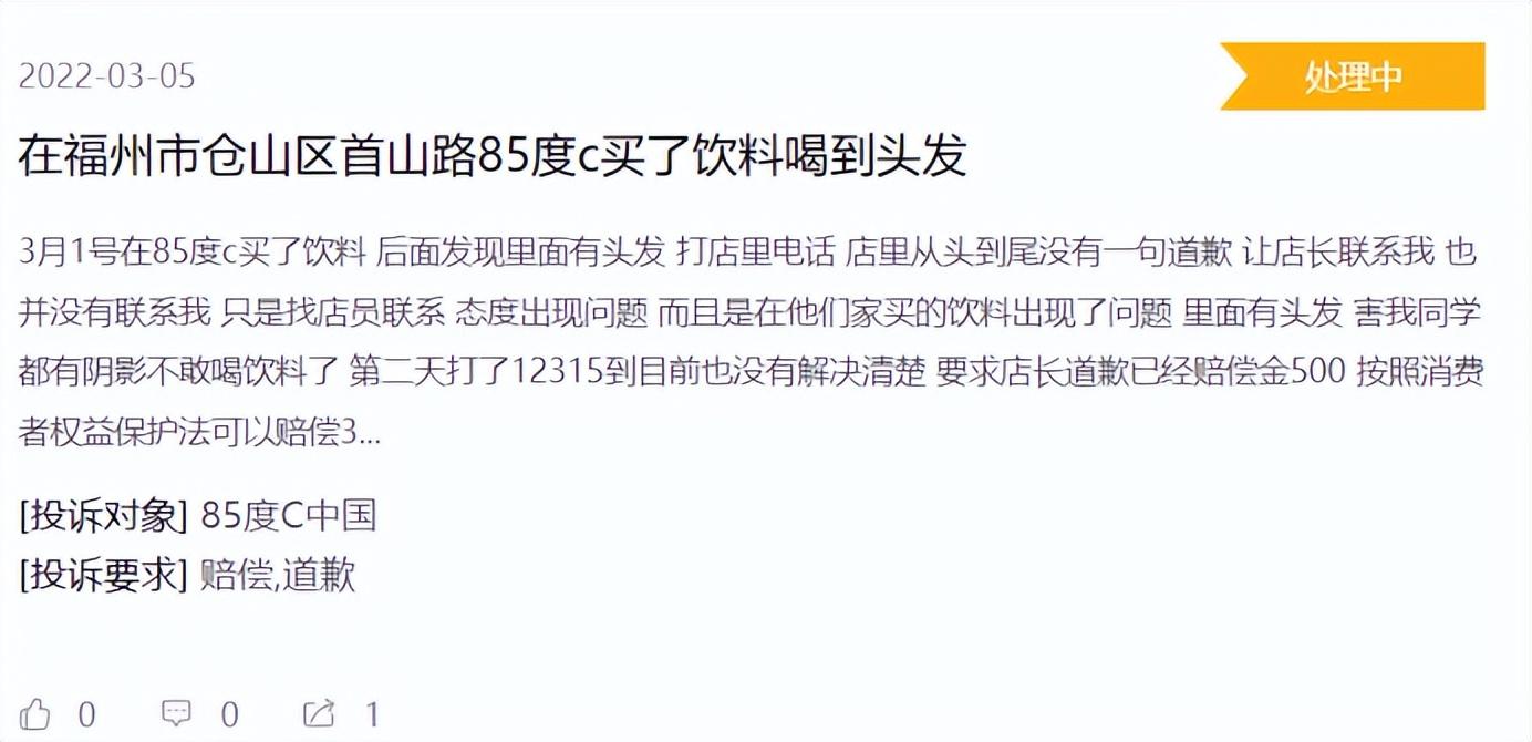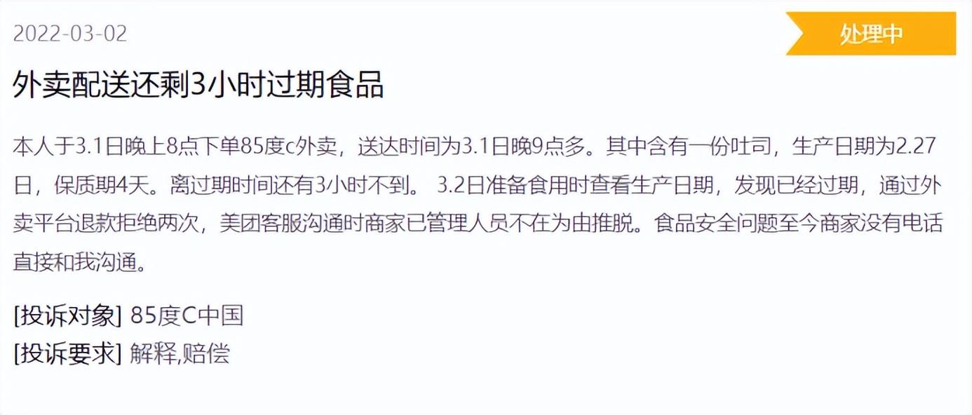 二是加盟模式,因对加盟店的控制不严,导致品牌形象受损,从2014年起陷入一系列食品安全漩涡。2014年85°C被曝使用地沟油、2018年人民日报点名批评85°C上海所有门店的的肉松面包并非使用真正的肉松、2020年上海市市场监管局爆出85°C当天制作“后天”蛋糕。在黑猫平台上也能看到有消费者投诉在面包里吃到包装塑料、饮料里有头发、外卖配送临期食品……