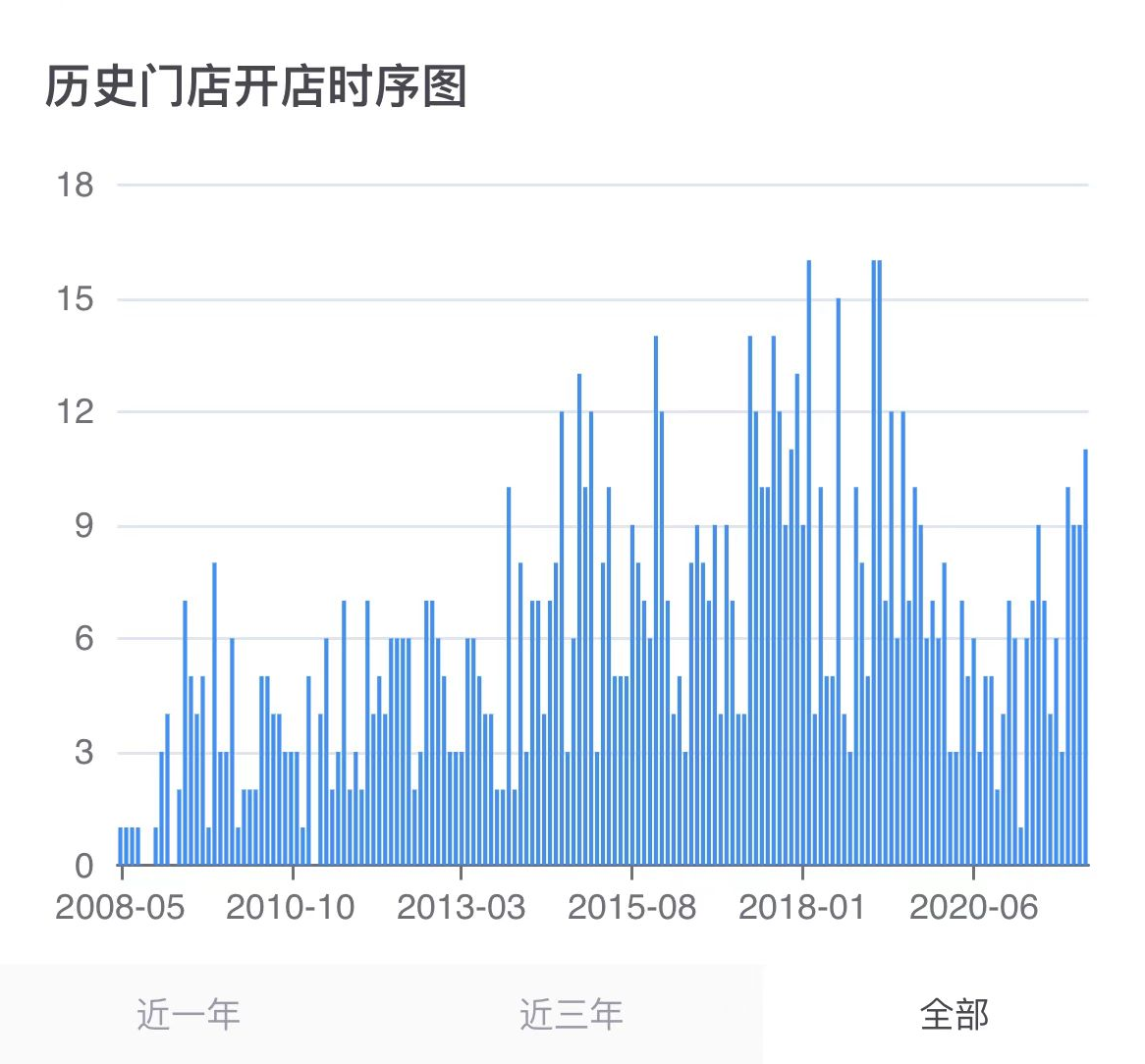 在台湾发展四年后,85°C在2007年登陆上海,开了内地第一家门店。根据寨门餐眼的数据显示,2014年-2019年,85°C高速扩张,2018年达到了开店高峰。2017年,85°C在美国开了全球第1000家。之所以高速扩张的原因,是因为85°C 在2014年末正式开启委托经营模式(由优秀员工承揽营运业务,但硬件设备仍由母公司出资负责,是开放加盟的过渡模式)。随后,因2020年疫情开店速度减缓,2021年又逐步恢复到了2013年的水平。